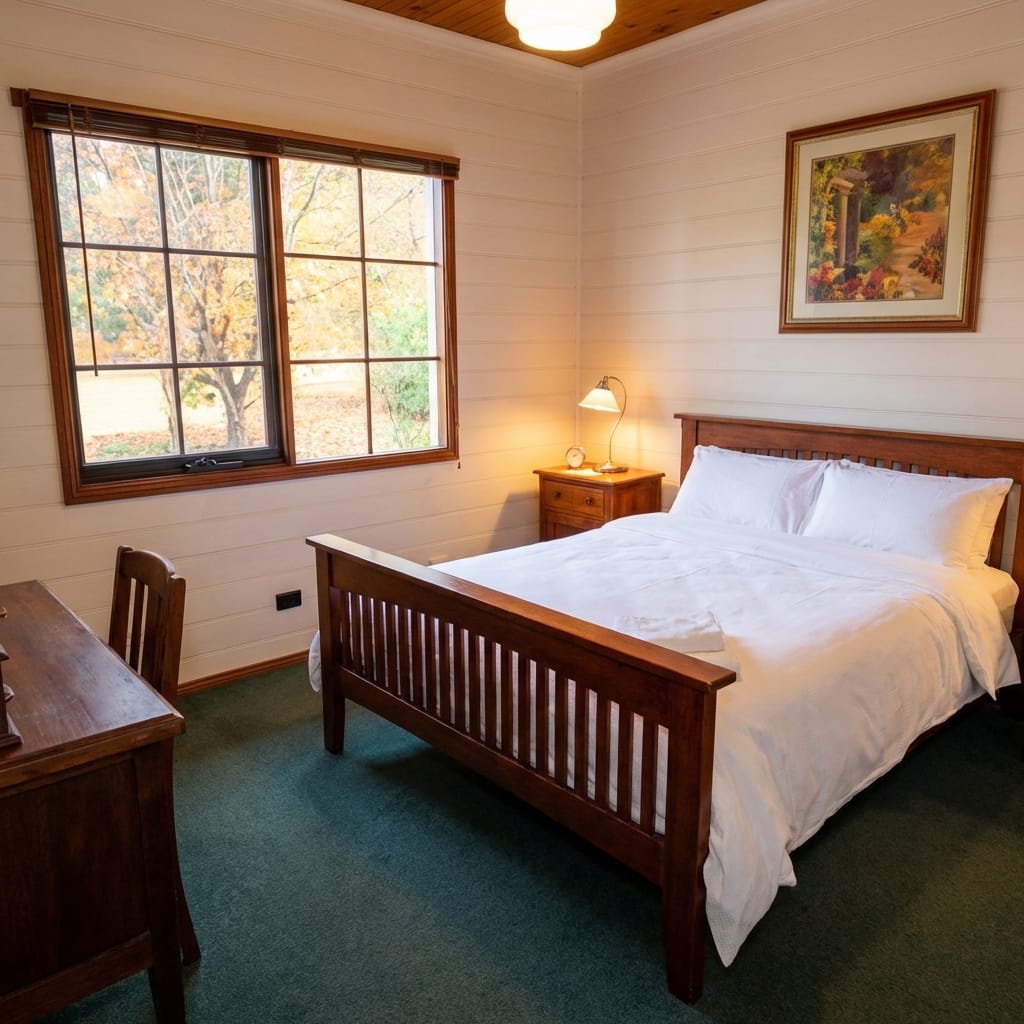A cosy and thoughtfully styled room with a comfortable double bed and soft natural light. Perfect for those seeking a private space to retreat, reflect, and recharge throughout the weekend.